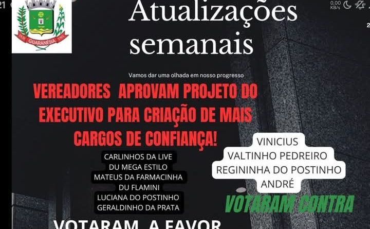 A principal responsável por essa decisão é LUCIANA AVELINO, seguida pelos vereadores CARLIN DA LIVE, DU MEGSTILO, DU FLAMINI, MATEUS DA FARMACINHA e GERALDINHO. Estes foram os seis nomes que se alinharam aos interesses do Executivo, traindo a confiança da população e abrindo espaço para mais cargos apadrinhados dentro da administração pública.