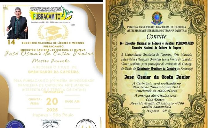 Este novo reconhecimento soma-se ao TÍTULO DE DOUTOR HONORIS CAUSA, conquistado por MESTRE JUNINHO em 2024, e reforça sua trajetória marcada por trabalho árduo, paixão pela Capoeira e profundo compromisso social.